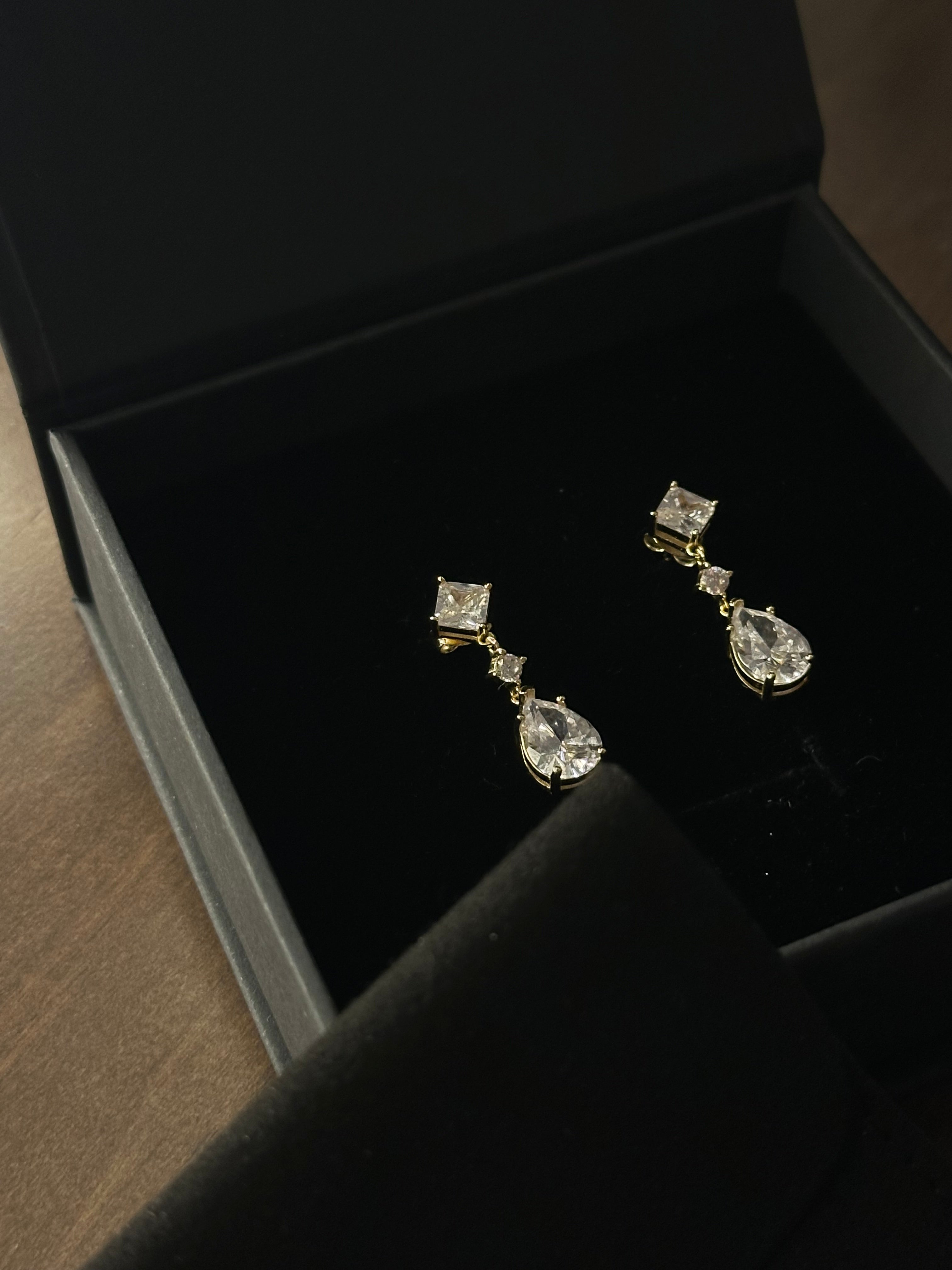 Maya er et elegant smykke som kombinerer myk femininitet med tidløs luksus. Øredobbene er utformet med nøye utvalgte, klare steiner i dråpeform som faller vakkert og naturlig langs øret. Den varme, gyldne innfatningen rammer inn steinene på en delikat måte og fremhever deres klare glans.